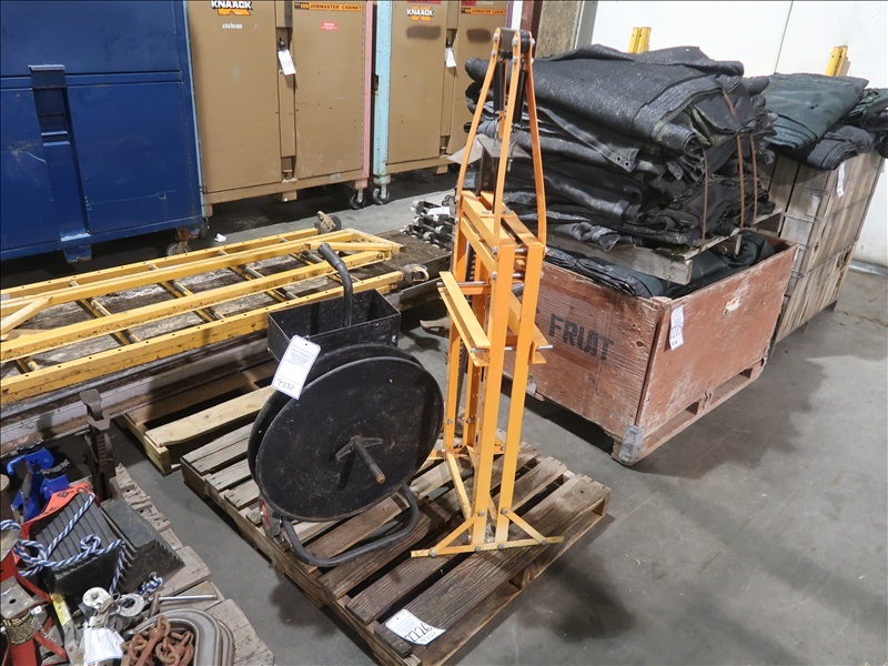 LOT, (1) HOSE REEL CART, (1) 47"H FARM JACK & (1) CENTRAL HYDRAULICS 12-TON SHOP PRESS ON THIS PALLET (MISSING PARTS, NEEDS REPAIR)