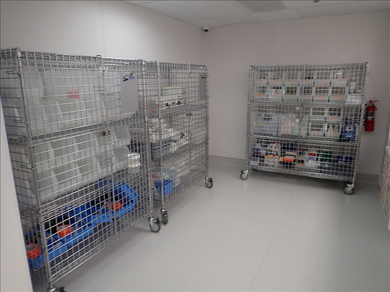 (3) LOCKING CAGES ON CASTERS W/ASSORTED LAB SUPPLIES