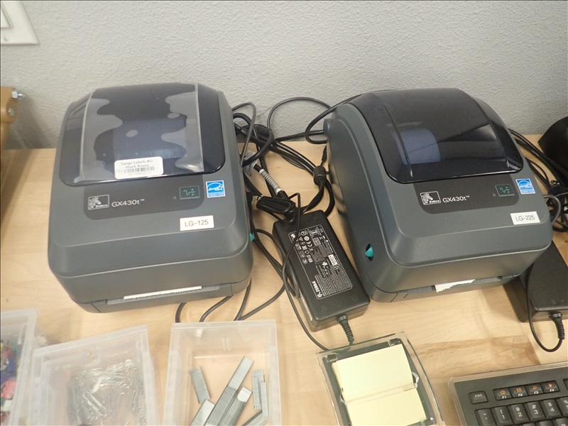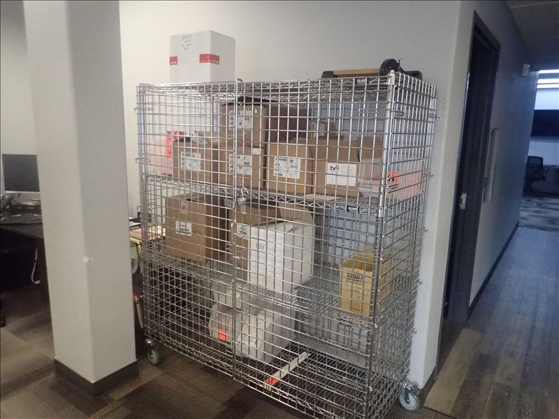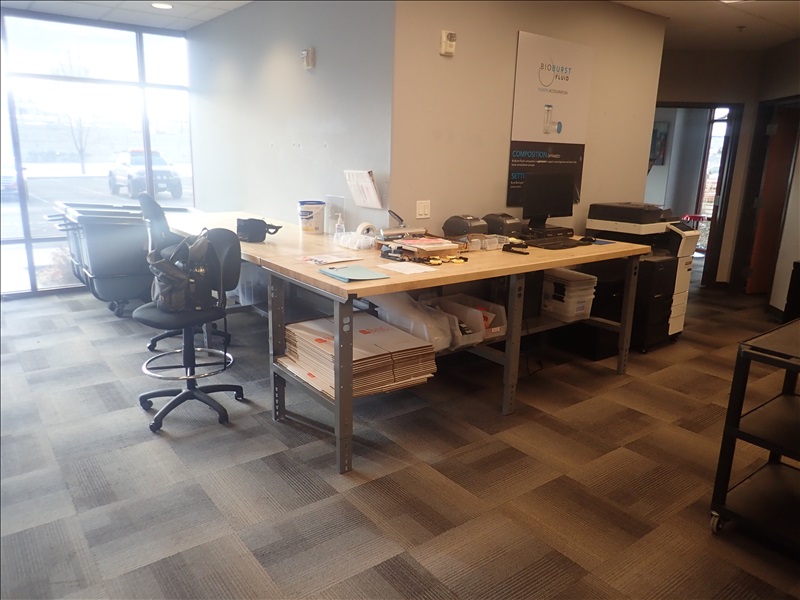 SHIPPING AREA TO INCLUDE: (4) MAPLE TOP BENCHES, CARTS, DUMP HOPPERS, WIRE CAGE, DESKS, LABEL PRINTERS & MISC.