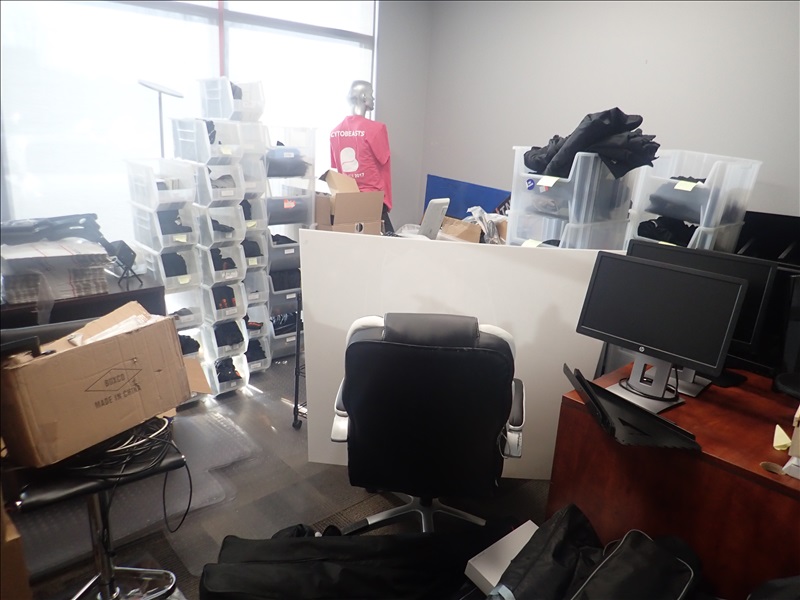 SUPPLY OFFICE W/MONITORS, CHAIRS, STOOLS, MARKETING SUPPLIES, DESKS & CLOTHES