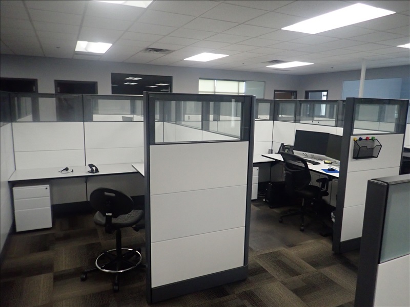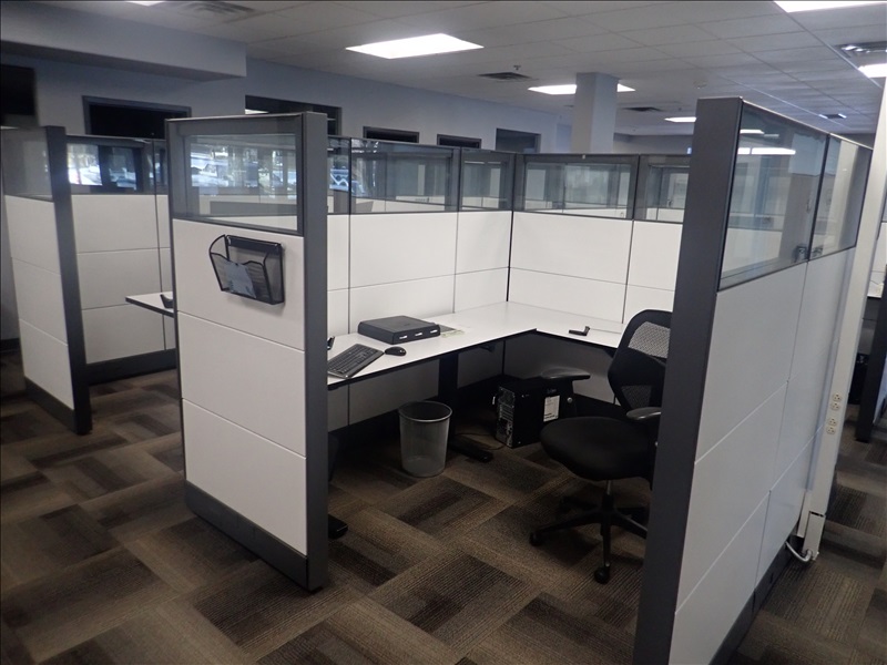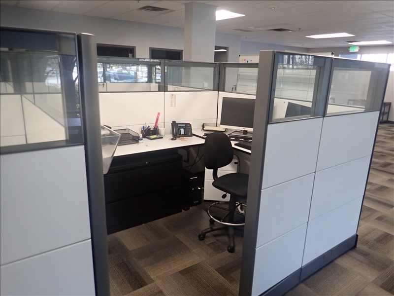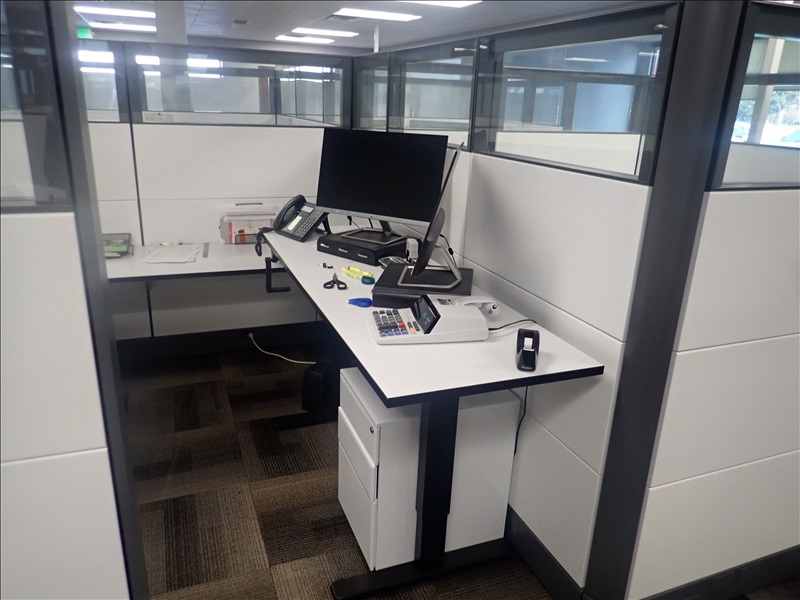 4-STATION CUBICLE W/STAND-UP DESKS, MONITORS & CHAIRS
