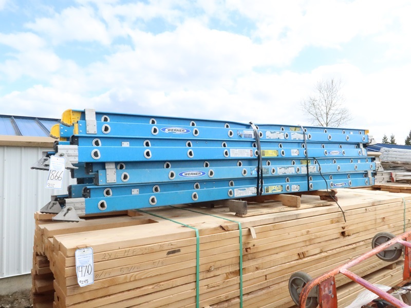 LOT, (3) WERNER 8' FIBERGLASS A-FRAME LADDERS, (4) 20' FIBERGLASS EXTENSION LADDERS & (1) 10' FIBERGLASS EXTENSION LADDER ON THIS PALLET (1 LADDER IS DAMAGED)
