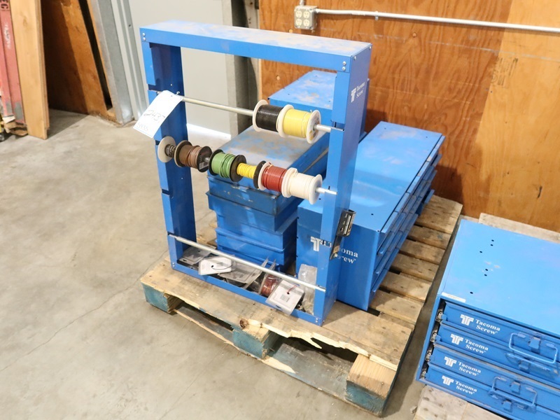 LOT, TOOL STORAGE BINS W/ASSORTED CONTENTS & (1) WIRE SPOOL RACK W/ASSORTED ELEC WIRES ON THIS PALLET (PALLET NOT INCLUDED)