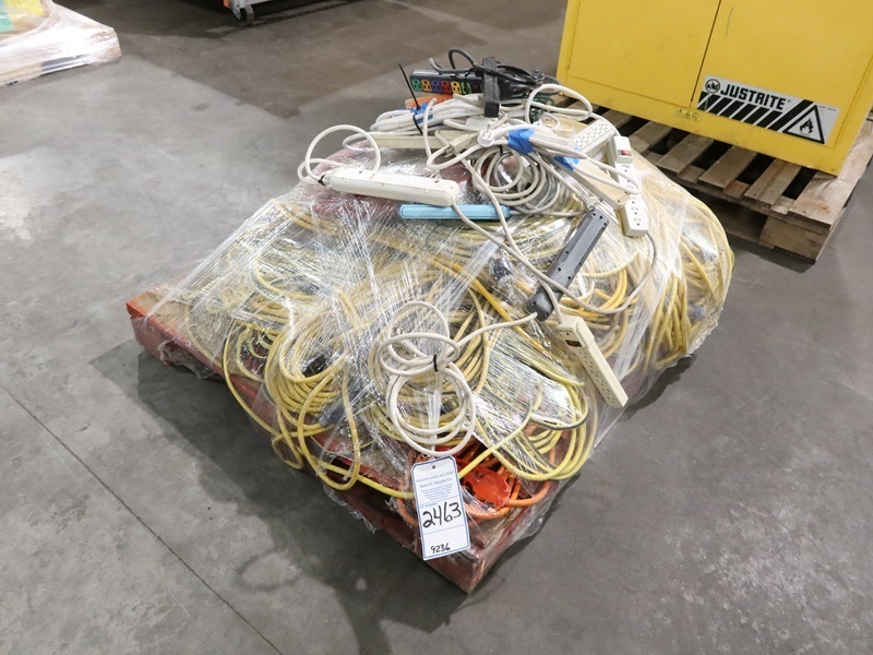 LOT, ASSORTED EXTENSION CORDS & SURGE PROTECTORS ON THIS PALLET (PALLET NOT INCLUDED)
