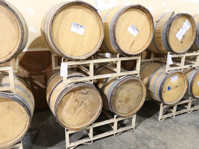 LOT, (4) DECORATIVE OAK BARRELS W/(2) BARREL STANDS (BARRELS NEED REPAIR)