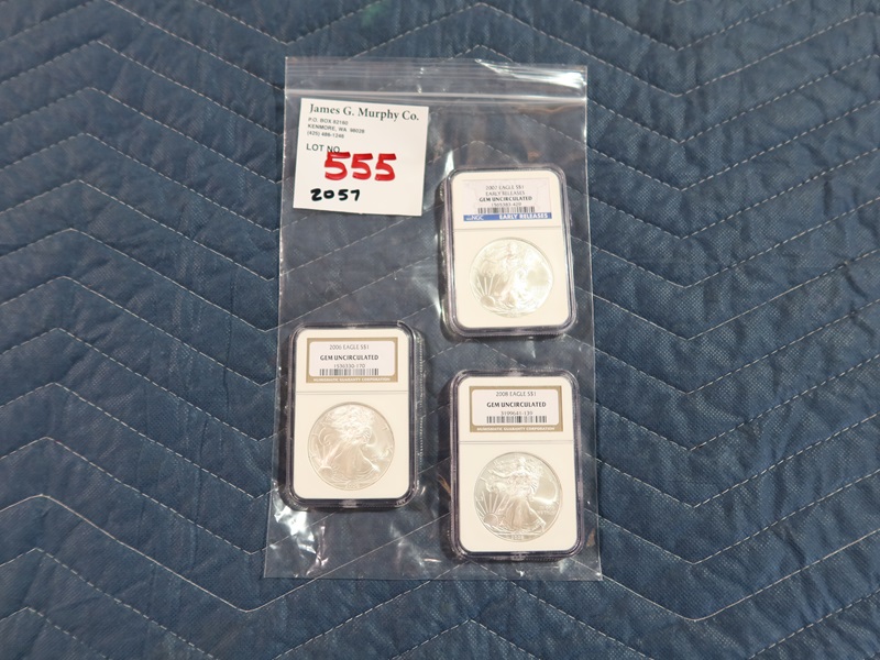LOT, (3) GEM UNCIRCULATED $1 SILVER EAGLES, (1) 2006, (1) 2007 & (1) 2008 (3 OZ .999 SILVER)