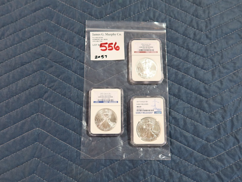LOT, (3) $1 SILVER EAGLES, (1) 2006, (1) 2007 GEM UNCIRCULATED & (1) 2017 MS69 (3 OZ .999 SILVER)