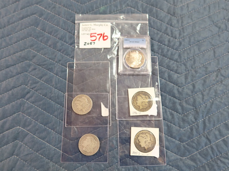 LOT, (5) ASSORTED MORGAN SILVER DOLLARS, (1) 1880X MS64, (1) 1885S, (1) 1894O, (1) 1896O & (1) 1902