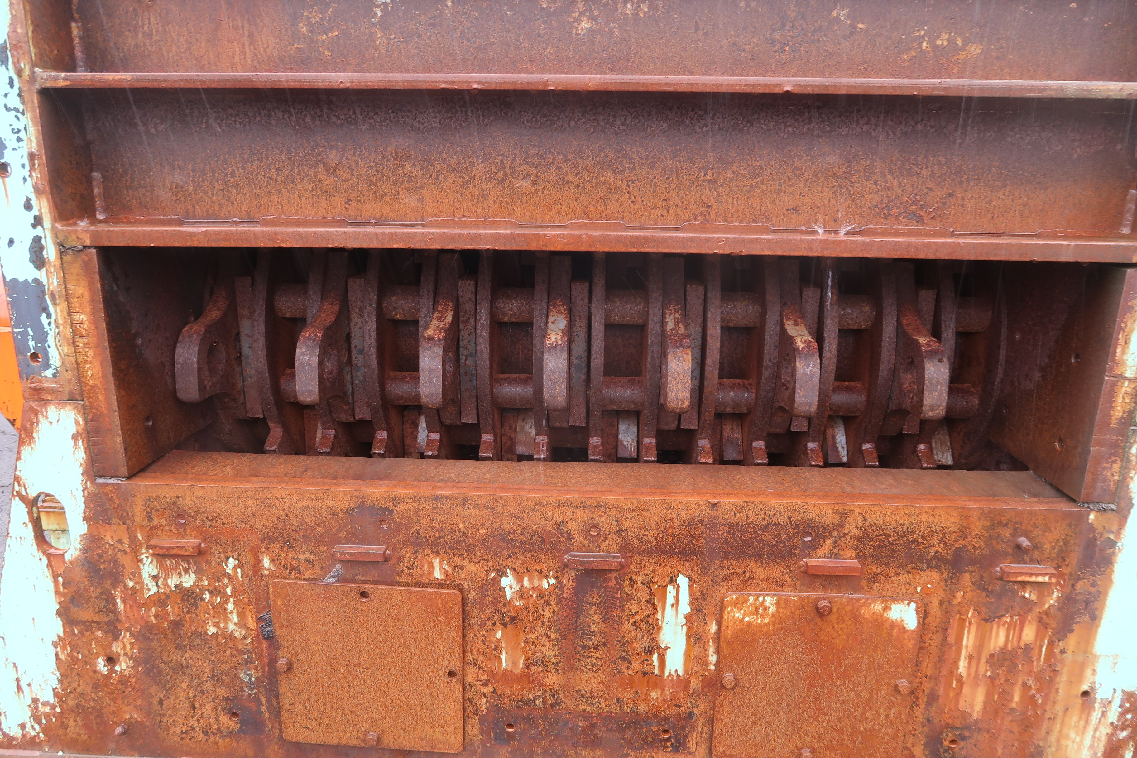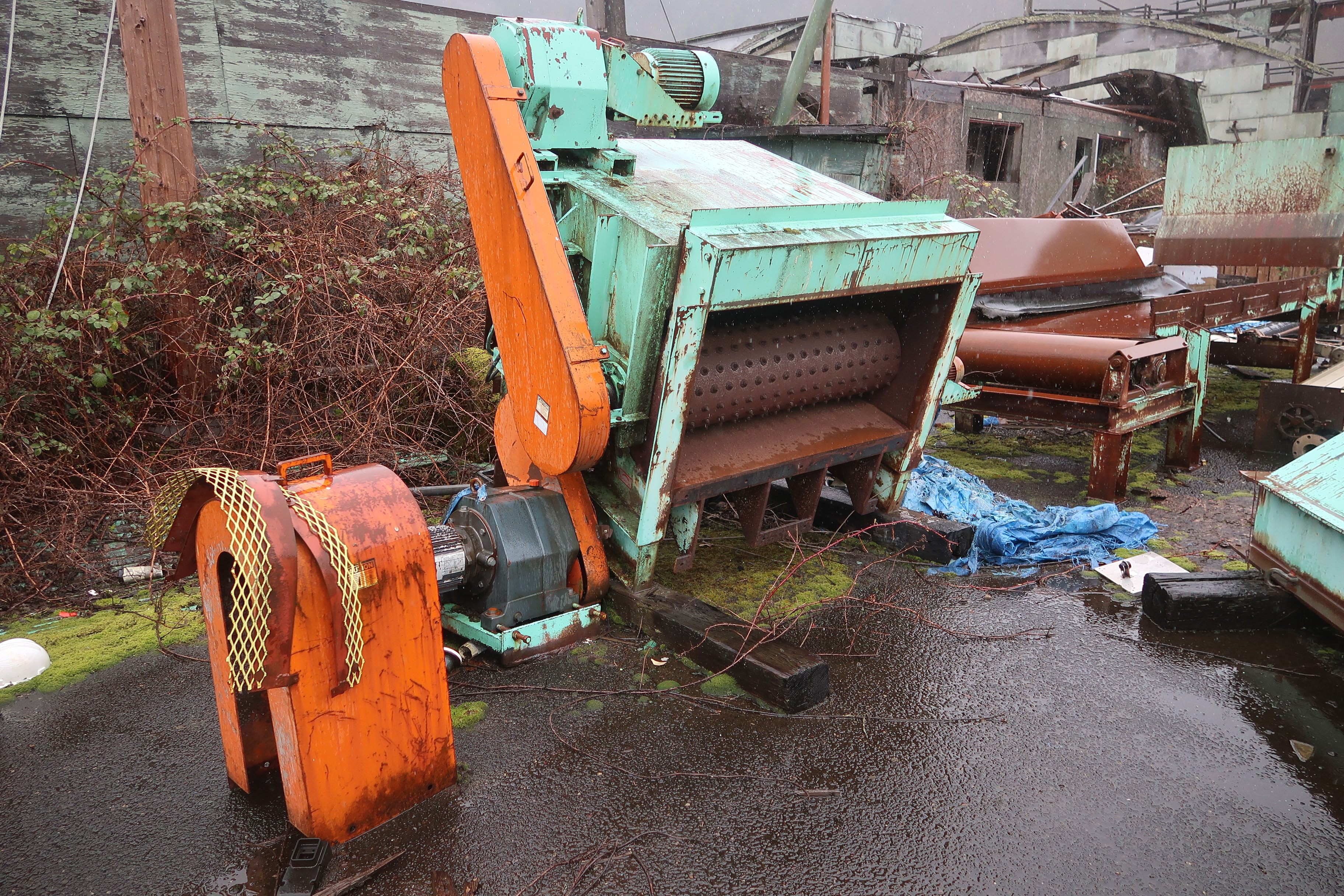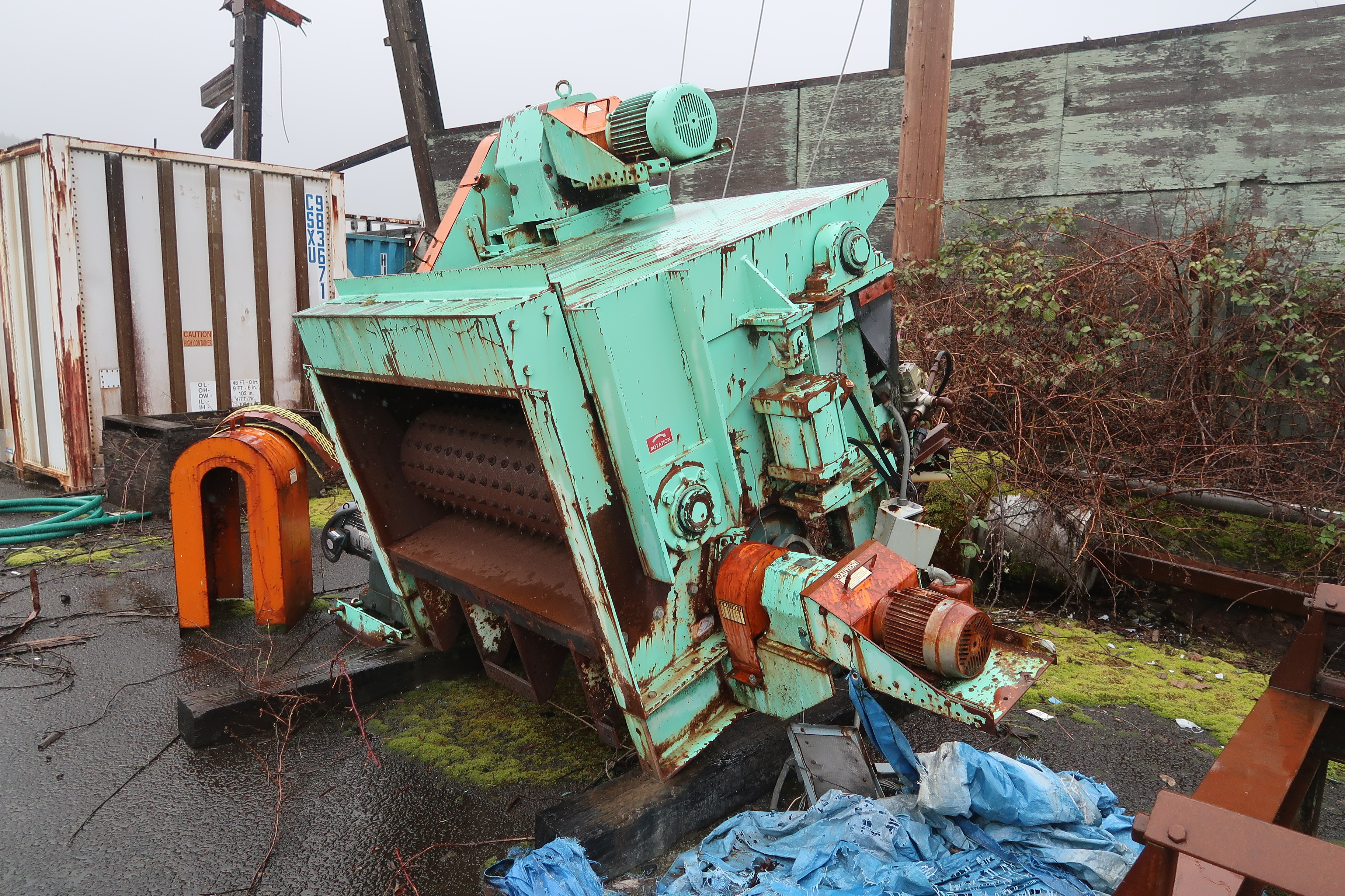 WOOD GRINDER W/56"X14" OPENING, 56"X34" ROTOR, 1-1/2" HAMMERS, 7/8" GRATES, HORIZONTAL INFEED, BOTTOM DISCHARGE (NO DRIVE MOTOR), 55" DRIVEN INFEED SPIKE ROLLS, APPROX. 54"X19' FEED BELT