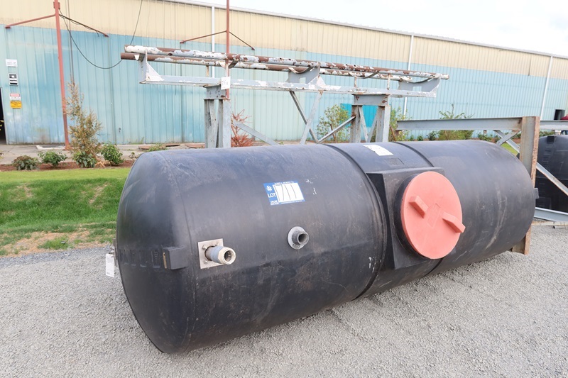 LOT, POLY CAL PLASTICS 1,000-GAL POLY LIQUIDS STORAGE TANK W/2' X 11' X 6' ELEVATED METAL STAND (MEASUREMENTS ARE APPROXIMATE)