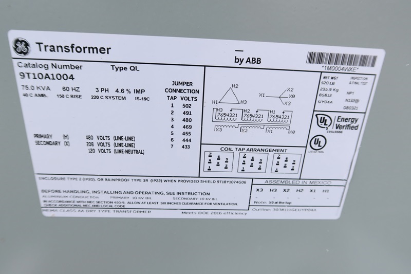 75 KVA TYPE QL TRANSFORMER, 120/208/480V, 3 PHASE