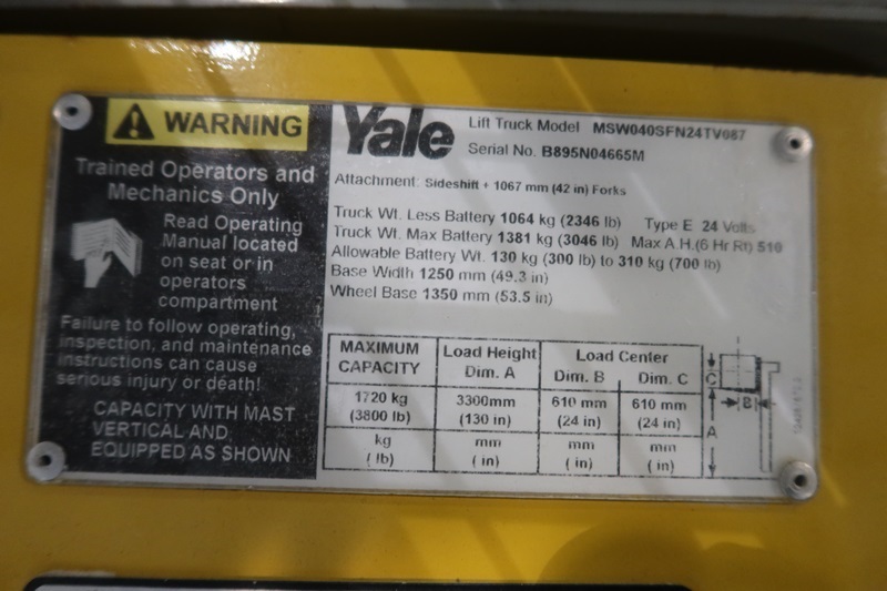 3,800 LB 24V, 4,000 LB ELECTRIC FORKLIFT WALKIE STACKER, 130" FORK HEIGHT, 2-STAGE MAST, CHARGER