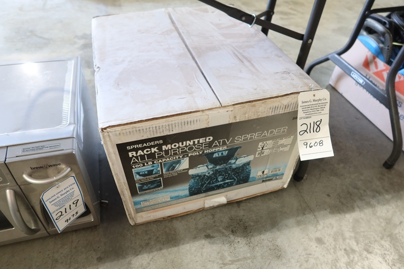 RACK MOUNTED ALL PURPOSE ATV SPREADER W/100 LB CAPACITY POLY HOPPER (UNUSED)