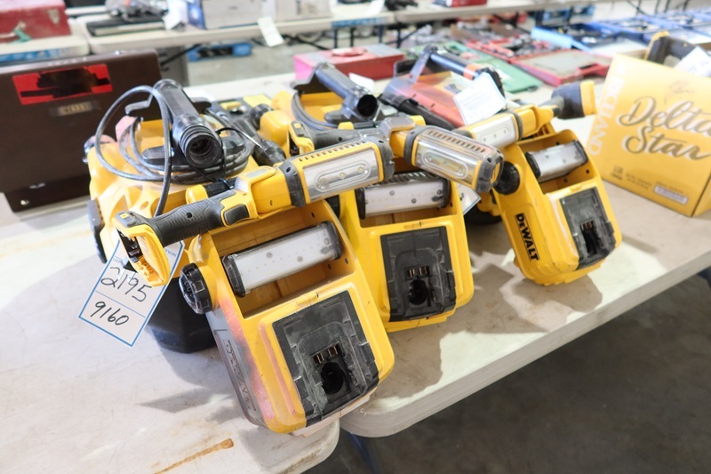 LOT, (3) DEWALT DCV580, 18/20V CORDLESS/115V VACUUMS W/ASSORTED LIGHTS (NO BATTERIES OR CHARGERS)