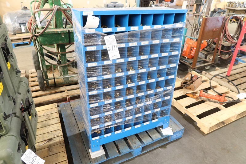 LOT, ASSORTED BRASS FITTINGS IN METAL STORAGE CABINET