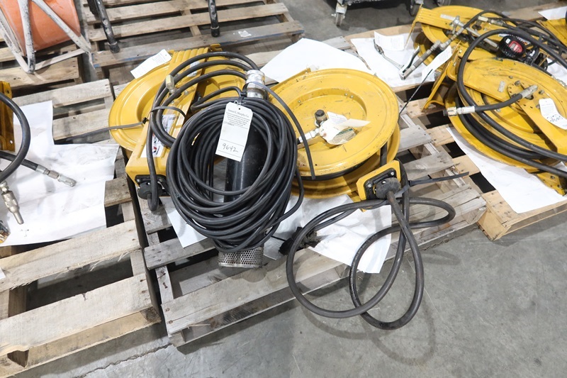 LOT, (2) GRACO SPRING DRIVEN GREASE HOSE REELS W/HOSE & (1) POWERFLO 2" SUBMERSIBLE WATER PUMP, 115V