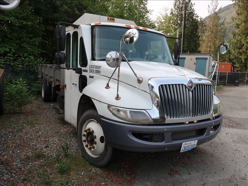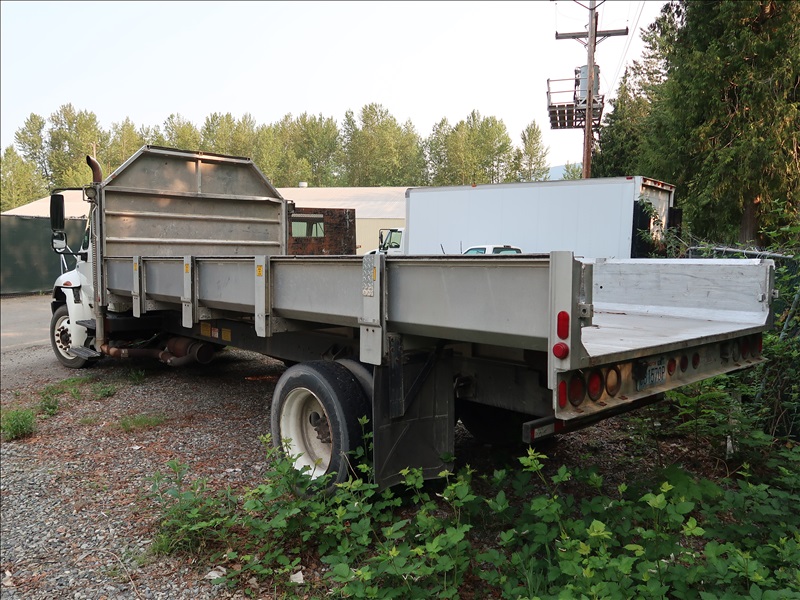 21' FLATBED DUMP TRUCK, DUAL STEERING WHEELS, AUTO, A/C, DIESEL ENGINE, AIR BRAKES
