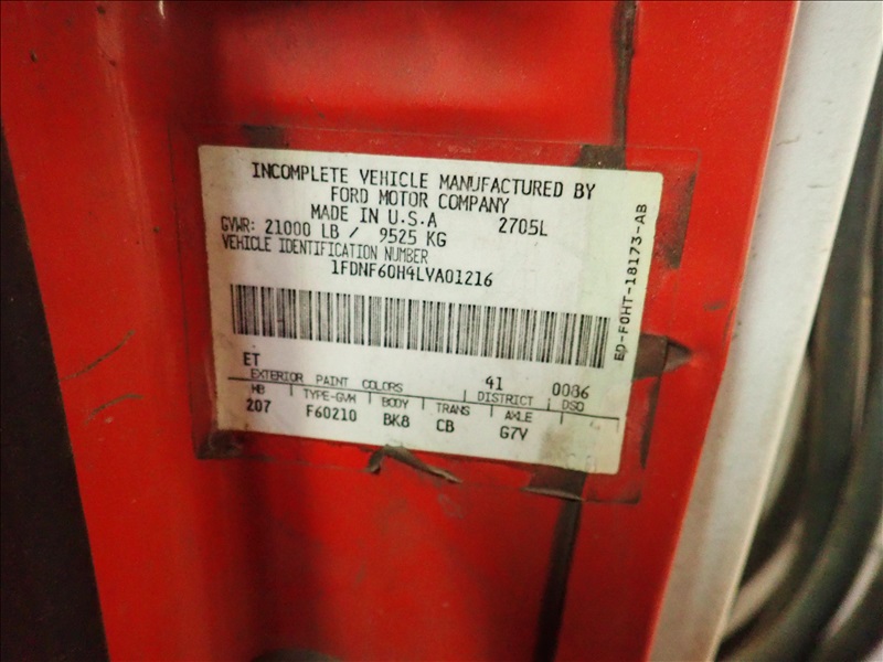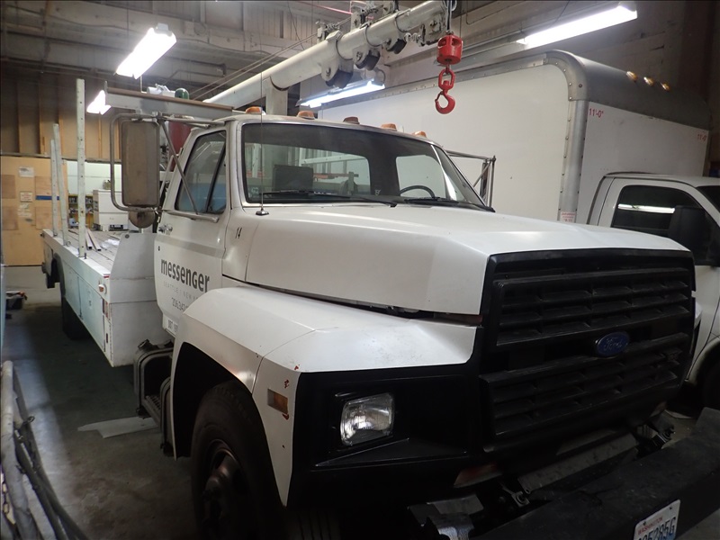 SIGN TRUCK, V8, GAS, 10 SPD, GARLAND 64 JR GOLIATH 1,550 LB CAP. CRANE (NEEDS NEW BEARING), MILLER BLUE CHARGER GAS WELDER/GENERATOR, TRUCK BOX, RACKS, S/N: 1FDNF60H4LVA01216, MILES: 185,300