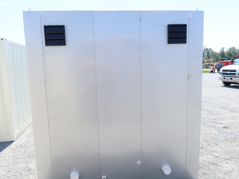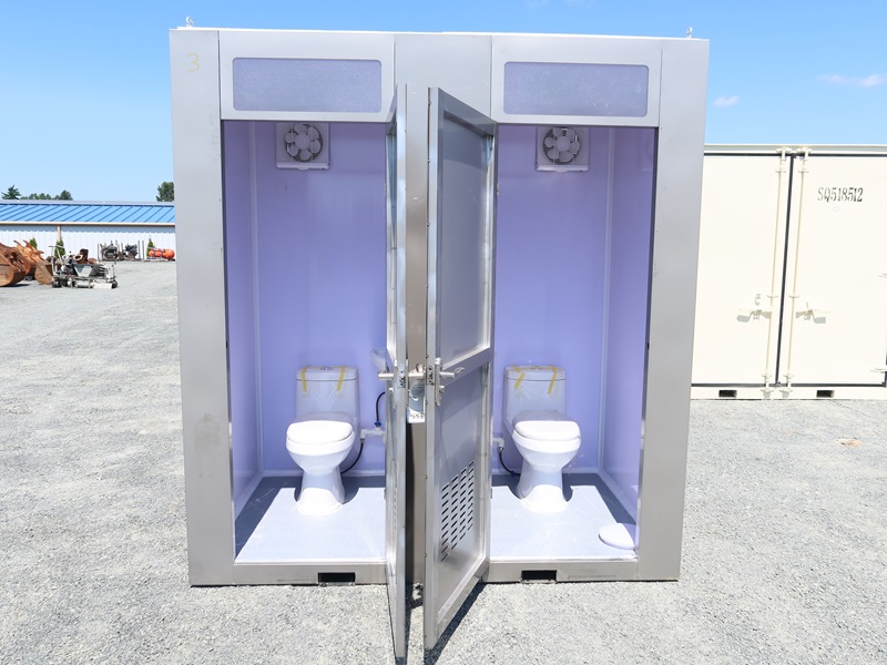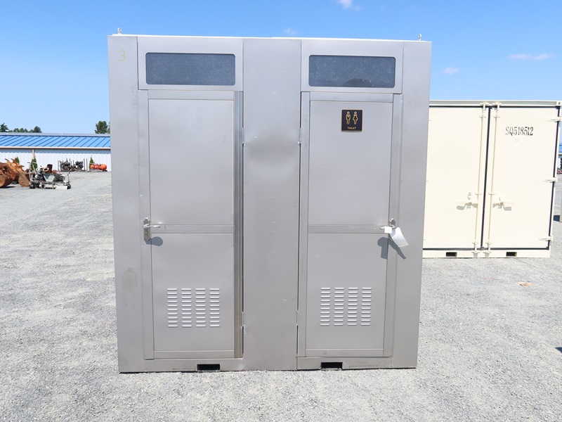 4' X 7' X 8' 2-DOOR PORTABLE RESTROOM W/TOILET, SINK, LIGHT & FUME EXTRACTOR W/FORK POCKETS (UNUSED, MEASUREMENTS ARE APPROXIMATE)