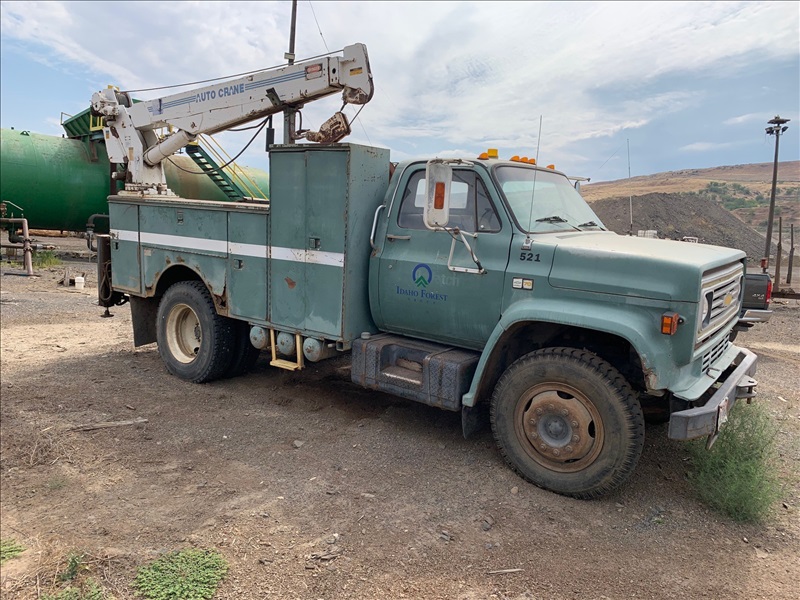 DUAL WHEEL SERVICE TRUCK W/V8 GAS ENGINE, MANUAL TRANSMISSION, 8,000 LB. CAP. AUTO CRANE, SERVICE BODY (LOCATED IN LEWISTON, ID. MUST MAKE AN APPOINTMENT TO PREVIEW, PLEASE CONTACT AUSTIN BRITTON AT 208-553-8614)