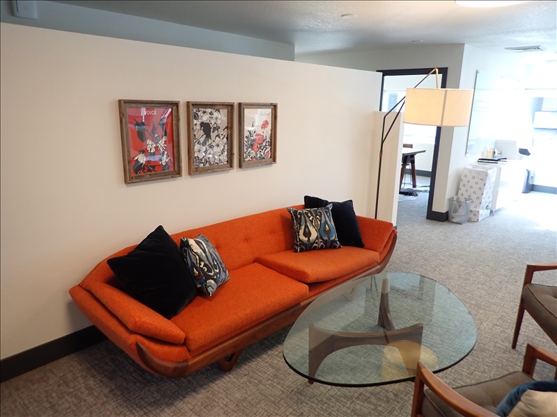 SOFA, COFFEE TABLE, LAMP, (3) FRAMED PRINTS
