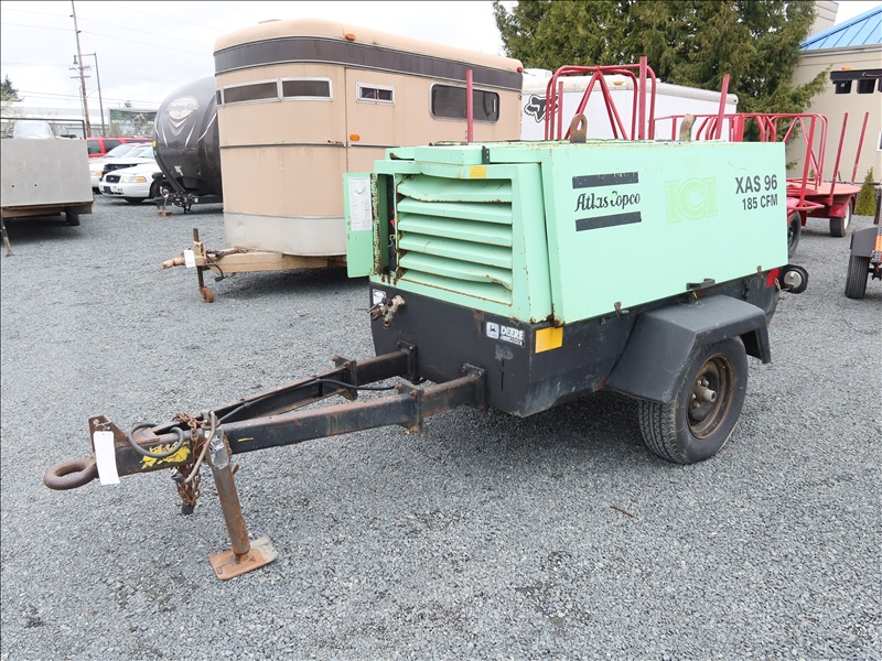 185 CFM TRAILER MOUNTED AIR COMPRESSOR, JOHN DEERE 4 CYL DIESEL, 205/75R14