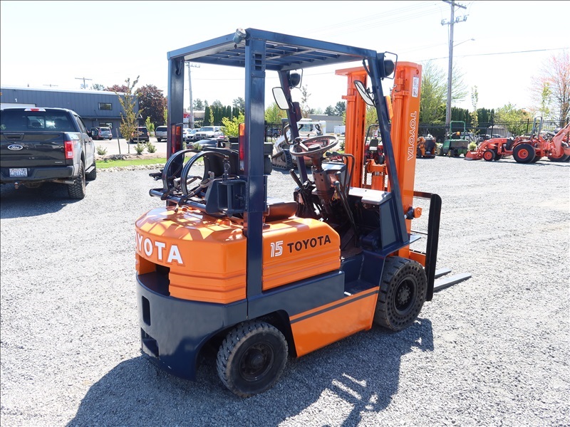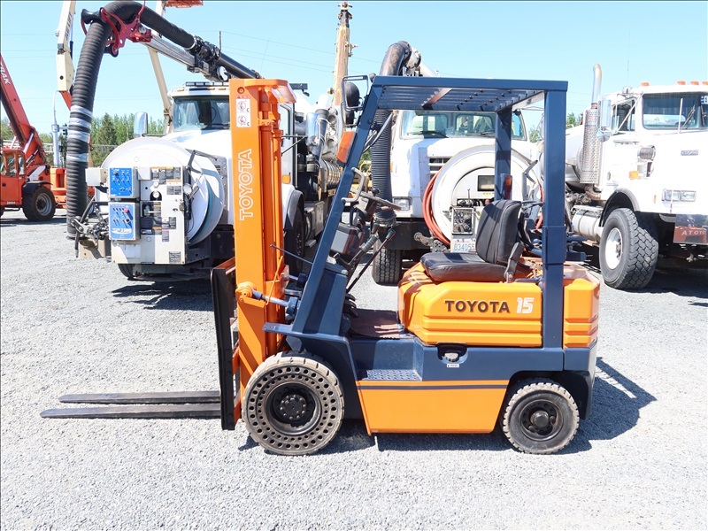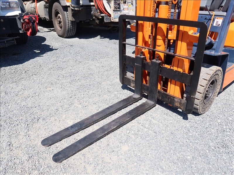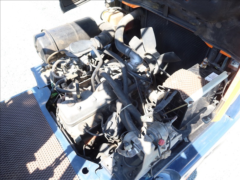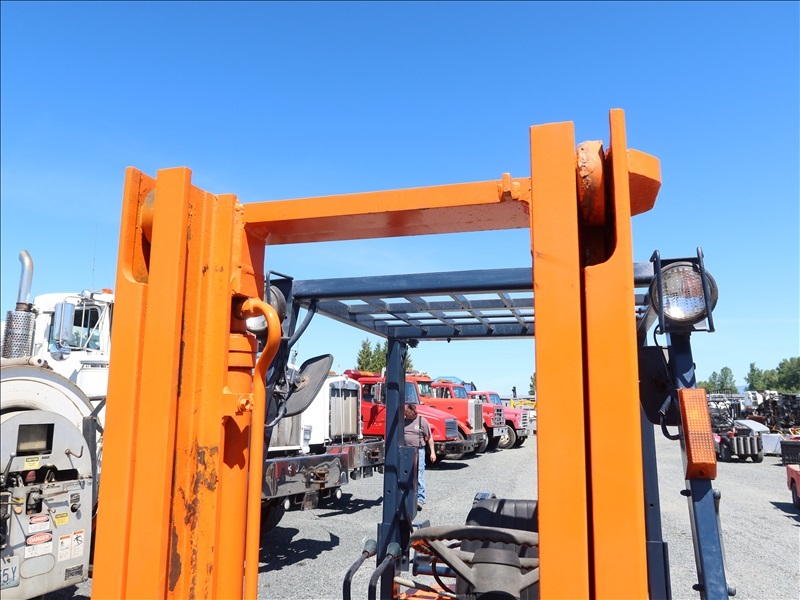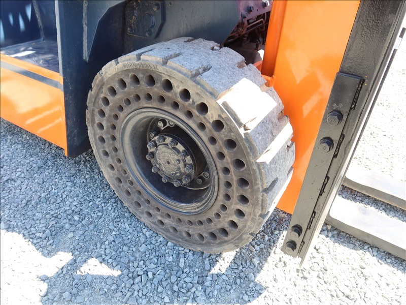 3,300 LB SOLID AIR TIRE FORKLIFT, 118" FORK HEIGHT, 2-STAGE MAST, 4 CYL GAS/LPG, NO PROPANE TANK (BRAKES NEED REPAIR)