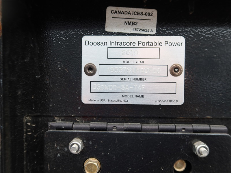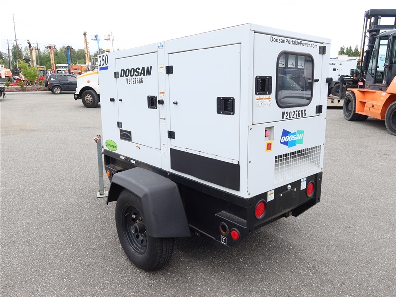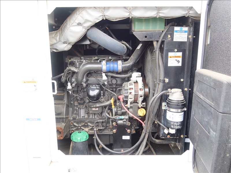 S/A, 48 KVA, TRAILER MOUNTED GENERATOR, DOOSAN 4 CYL DIESEL, 120/208/240/480V, SINGLE OR 3 PHASE, ELECT BRAKES, HOUR METER READS: 4,504
