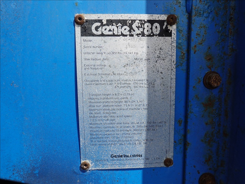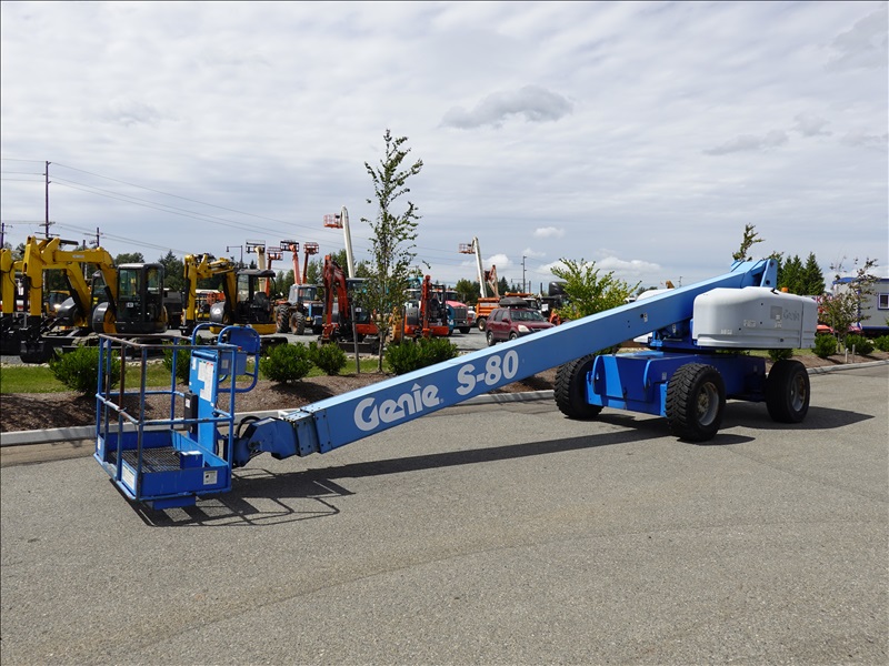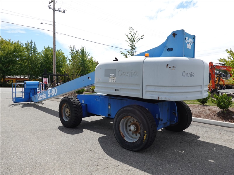 2WD TELESCOPIC BOOM LIFT, 80' PLATFORM HEIGHT, 71' HORIZONTAL REACH, 500 LB CAPACITY, A/C RECEPTACLE AT PLATFORM, FORD 4 CYL LPG