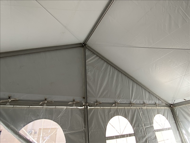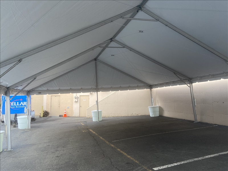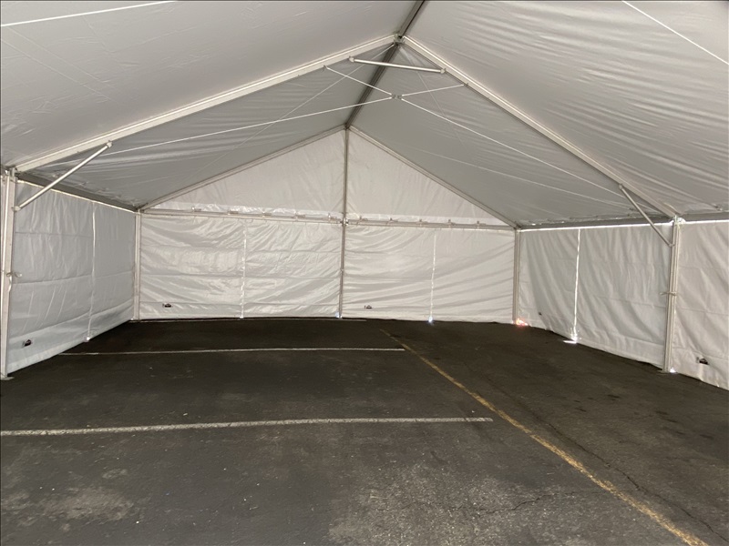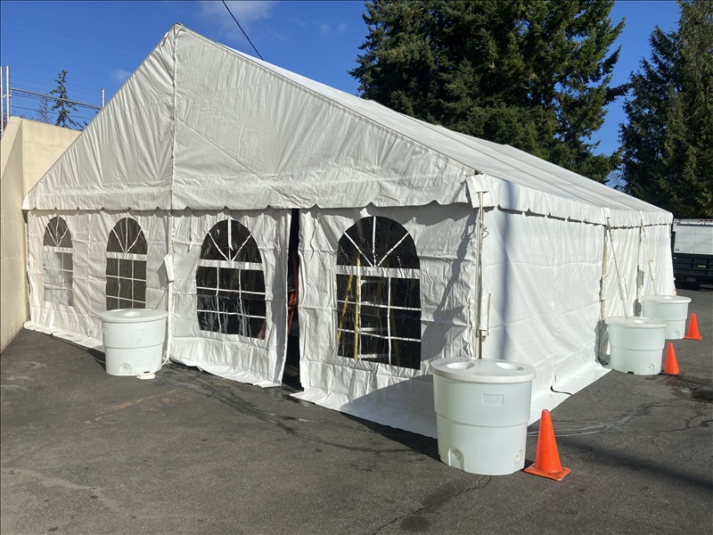 30'X40' KEDER GABLE (SLIDE IN TOP) VINYL TENT W/ROLLER WALL & JEFFY TENT WEIGHT POLY BARRELS (SETUP FOR DISPLAY AT PREVIEW)