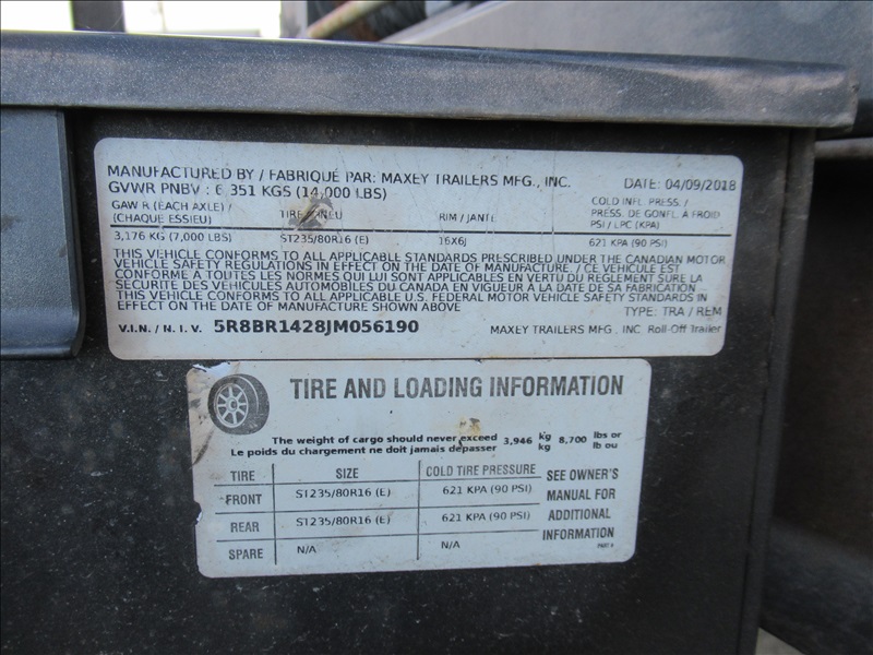 15' T/A ROLL OFF TRAILER W/SUPERWINCH 180 ELECTRIC WINCH, ELECTRIC/HYDRAULIC TILT, PENDANT CONTROLS, S/N: 5R8BR1428JM056190
