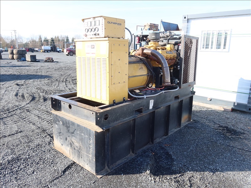 SKID MOUNTED GENERATOR W/CAT 3208 8 CYL DIESEL ENGINE, OLYMPIAN CONTROLS, NEWCO FAB 89464E CLOSED TOP DIKE GENERATOR BASE, 240/480/600V, HOUR METER READS: 702