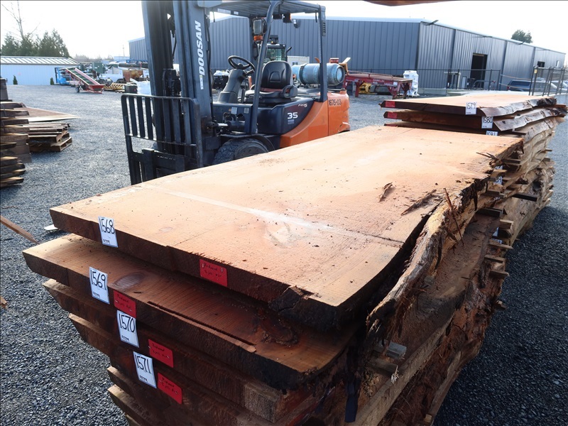 2-1/2" X 98" 2-YEAR AIR DRY LIVE EDGE REDWOOD SLAB (LARGE END 43", SMALL END 42", MEASUREMENTS ARE APPROX)