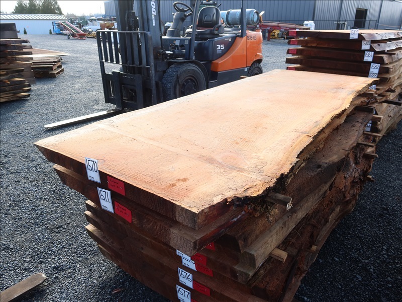 2-1/2" X 98" 2-YEAR AIR DRY LIVE EDGE REDWOOD SLAB (LARGE END 38", SMALL END 36", MEASUREMENTS ARE APPROX)