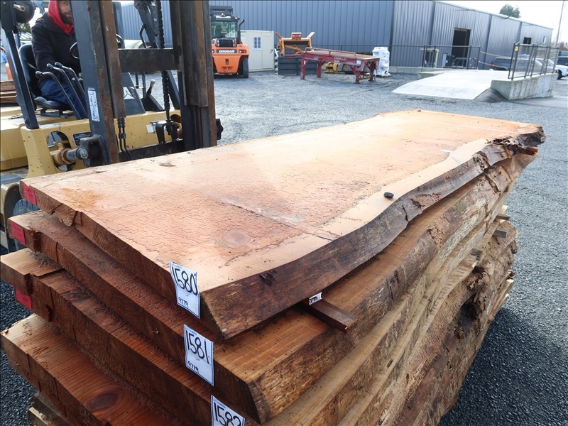 2-1/2" X 99" 2-YEAR AIR DRY LIVE EDGE REDWOOD SLAB (LARGE END 40", SMALL END 33", MEASUREMENTS ARE APPROX)