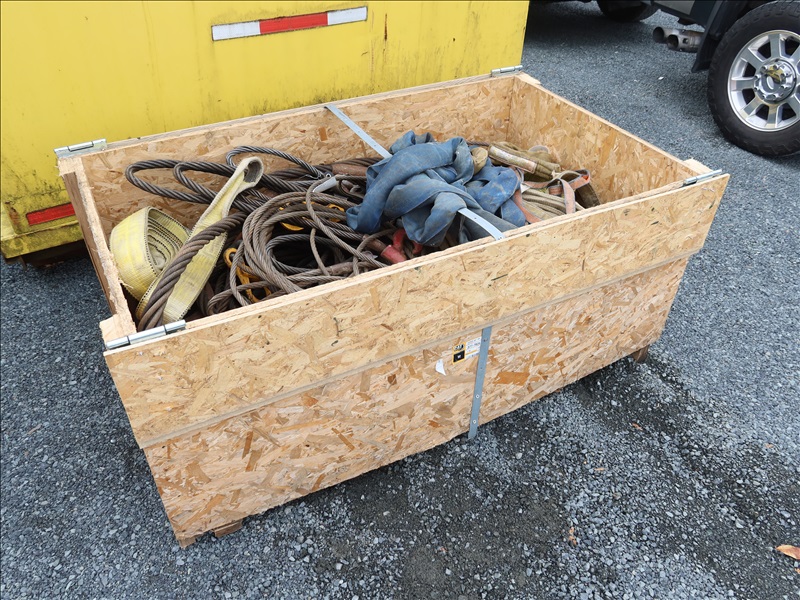 LOT, ASSORTED RIGGING STRAPS & CABLES IN THIS BIN (MUST TAKE BIN)