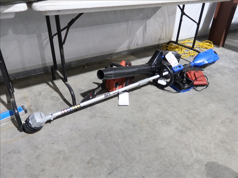 LOT, KOBALT BLOWER & STRING TRIMMER W/BATTERY & CHARGER, 80V & 14" SKIL CHAINSAW W/BATTERY & CHARGER (NEEDS REPAIR)