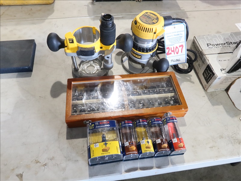 LOT, DEWALT DW618 2-1/4 HP ELECTRONIC ROUTER W/PLUNGE ROUTER BASE & APPROX (34) BITS