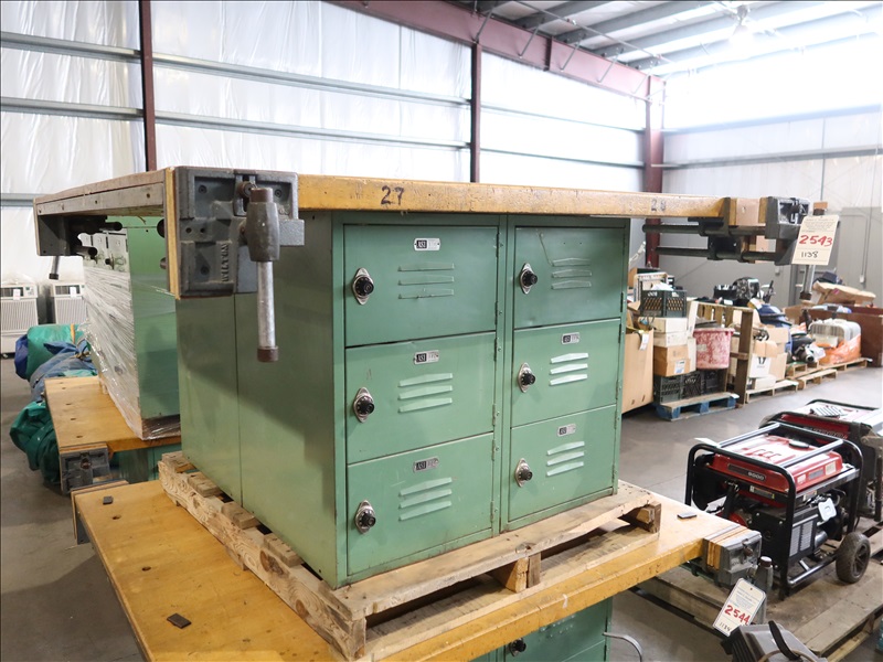 54" X 64" WORK TABLE W/(4) WILTON WOOD VISES & (12) LOCKERS (NO COMBINATIONS)