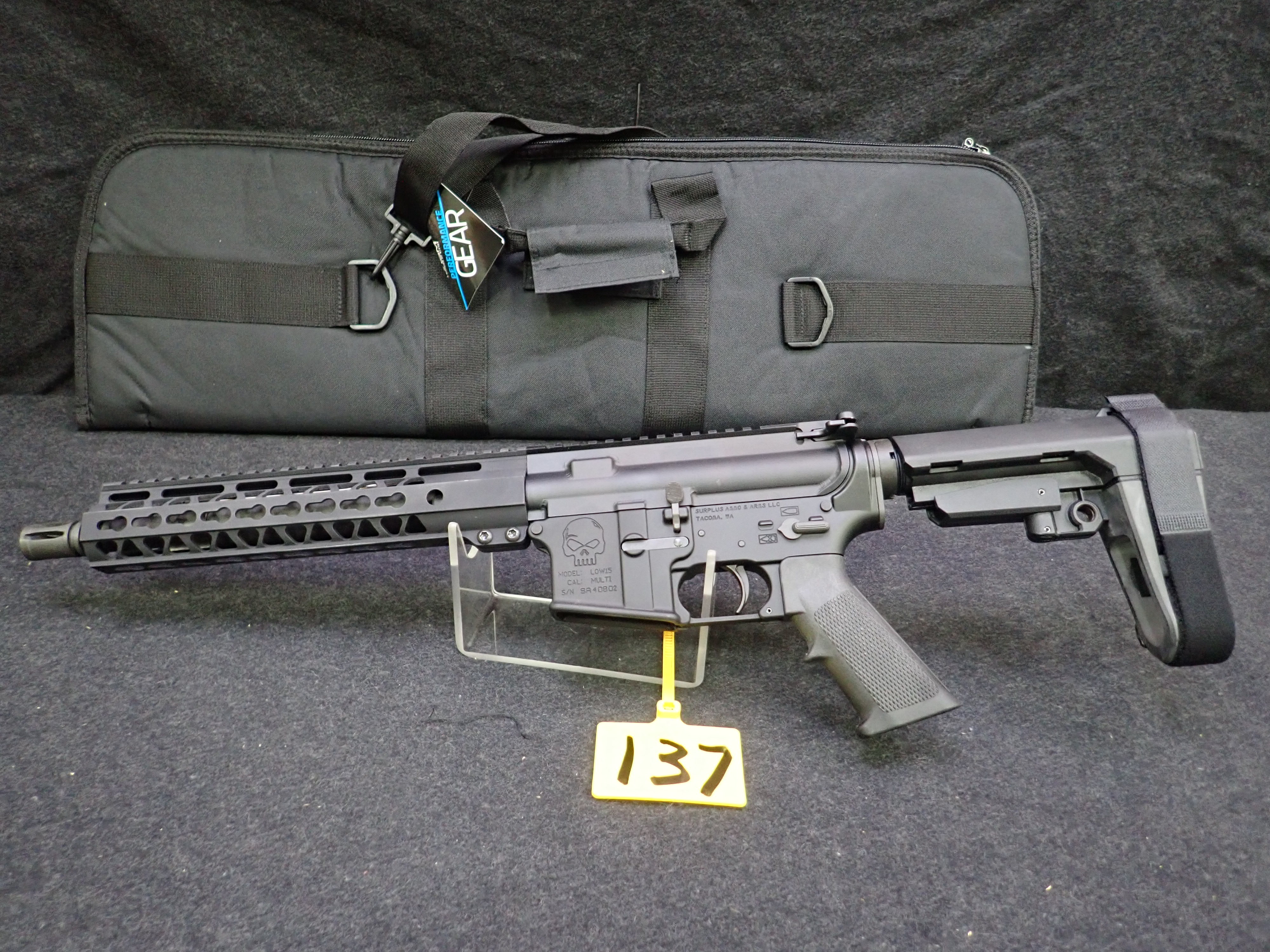 5.56 SEMI-AUTOMATIC PISTOL, 10.5" BARREL, SBA3 PISTOL BRACE, "SKULL" ENGRAVED W/SOFT CASE (UNUSED, THIS FIREARM ALSO REQUIRES AN 11% FEDERAL EXCISE TAX)
