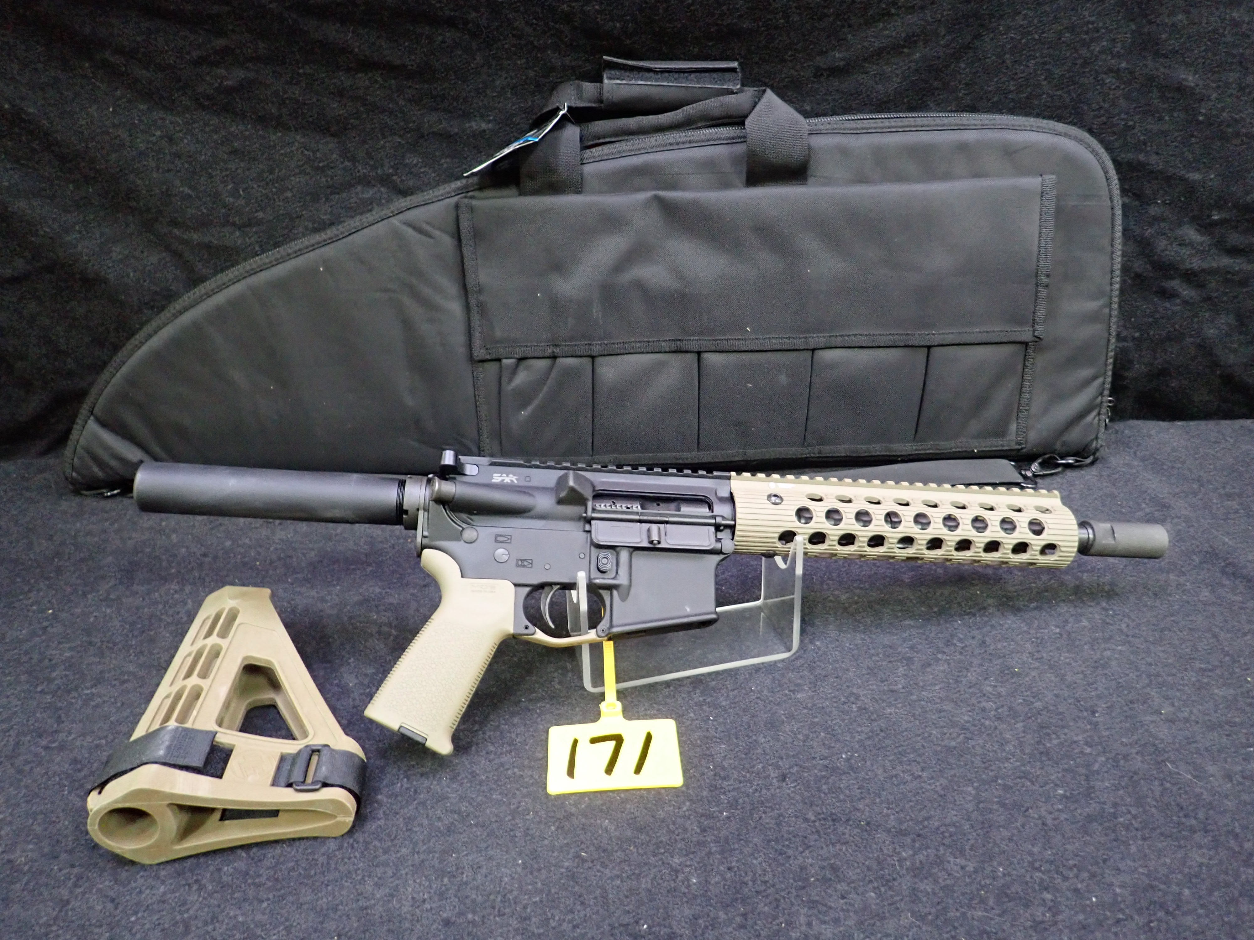 300 BLACKOUT SEMI-AUTOMATIC PISTOL, 10.5" BARREL, SBM4 PISTOL BRACE, "REAPER" ENGRAVED W/SOFT CASE (UNUSED, THIS FIREARM ALSO REQUIRES AN 11% FEDERAL EXCISE TAX)