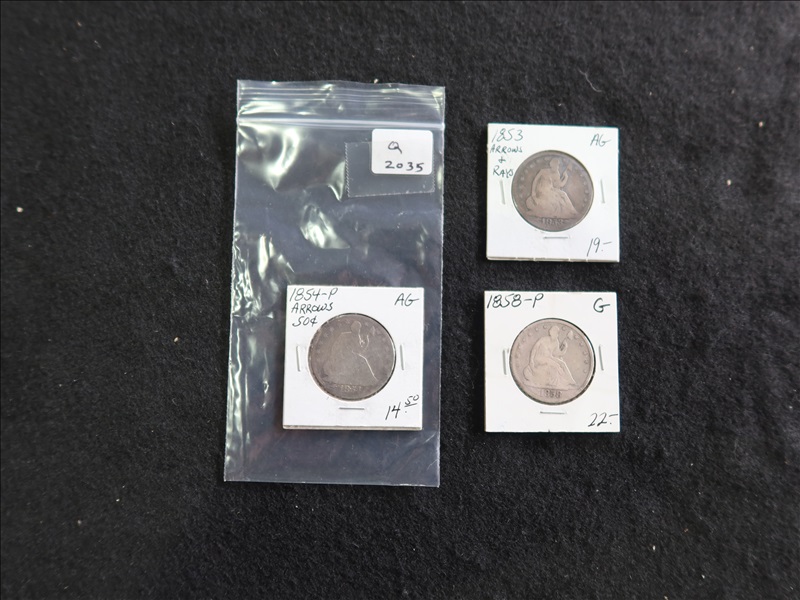 LOT, (3) ASSORTED LIBERTY SEATED HALF DOLLARS TO INCLUDE: (1) 1853, (1) 1854 & (1) 1858