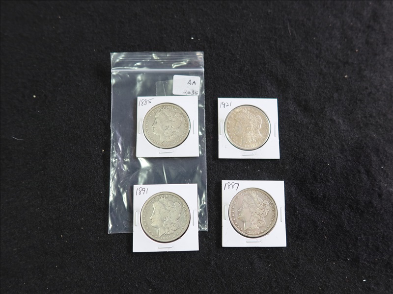 LOT, (4) ASSORTED MORGAN SILVER DOLLARS TO INCLUDE: (1) 1885, (1) 1887, 1891 & (1) 1921