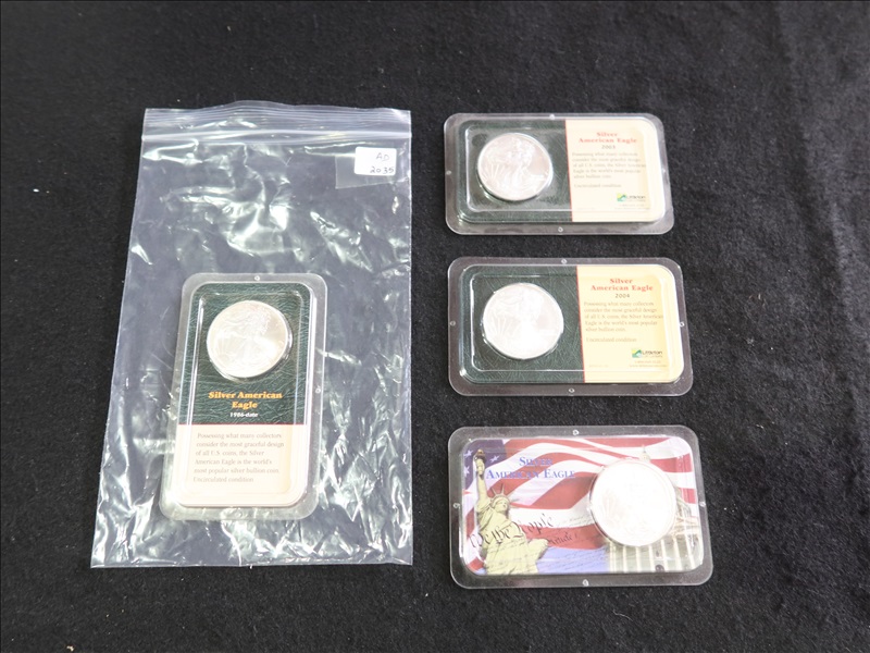 LOT, (4) ASSORTED SILVER EAGLES TO INCLUDE: (1) 2000, (1) 2003, (1) 2004 & (1) 2008