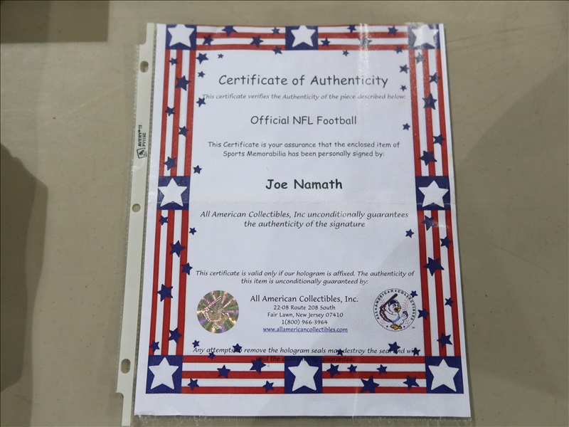 FOOTBALL AUTOGRAPHED BY JOE NAMATH W/CERTIFICATE OF AUTHENTICITY
