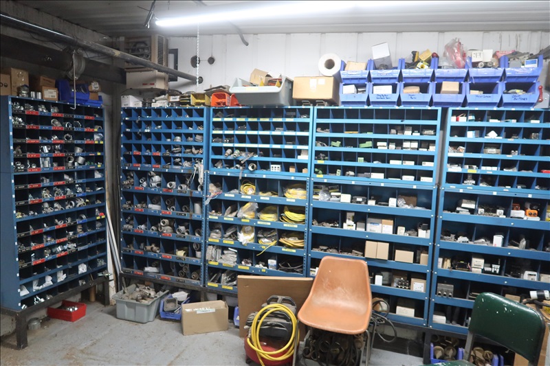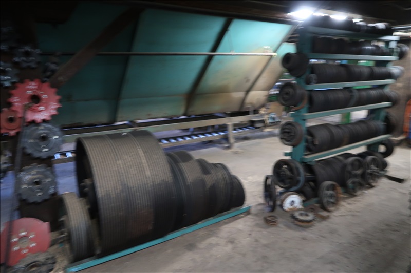 LARGE QUANTITY OF BEARINGS; SPROCKETS; COUPLERS; MILL CHAIN; BUSHINGS; BELTS; NUTS & BOLTS BINS; VALVES; AIR BAGS; PIPE FITTINGS; CYLINDERS; HYDRAULIC MOTORS & PUMPS; MACHINE PARTS; BELTING; SHAFTING; HYDRAULIC HOSE & FITTINGS; (100+) SPARE MOTORS & REDUCERS; ASSORTED ENGINE BLOCKS; STARTERS; ALTERNATORS; GENERATORS; CYLINDERS; FILTERS; HOSES; TIRES; RIMS; HUBS