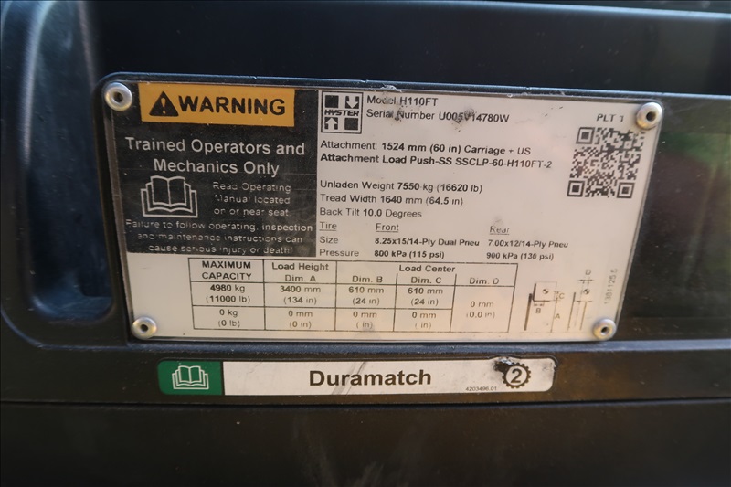 11,000 LB. CAP. DUAL PNEUMATIC TIRE FORKLIFT, KUBOTA 3.8 LITER TURBO DIESEL ENGINE, 134" 2-STAGE MAST, LUMBER PUSH ATTACHMENT, LUMBER FORKS, FINGERTIP CONTROLS, MONOTROL