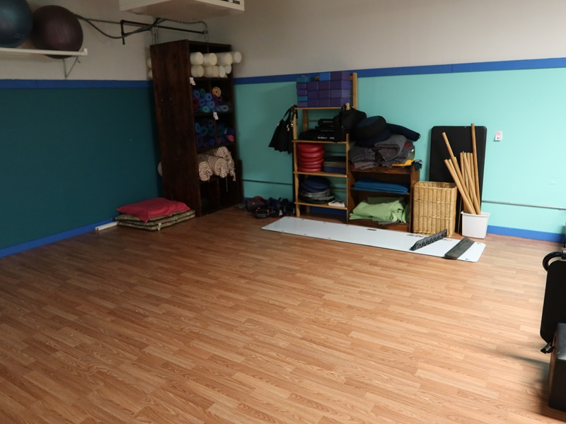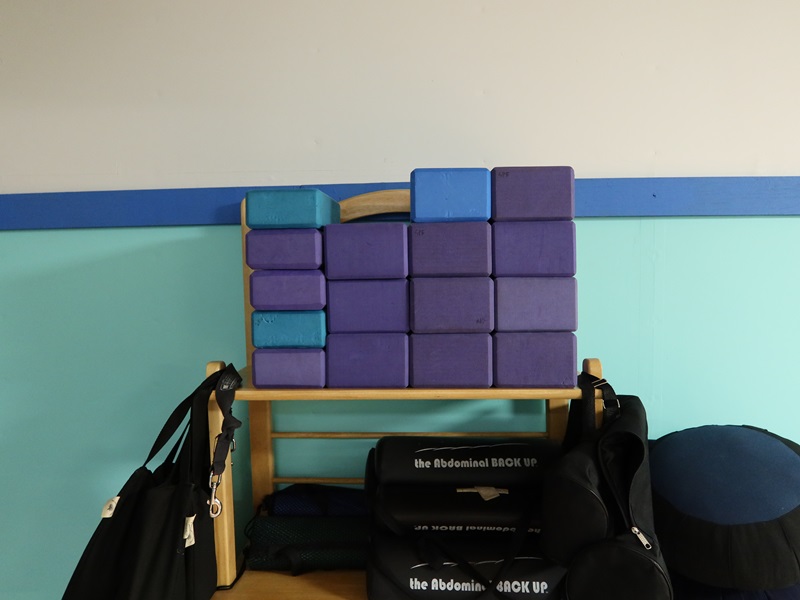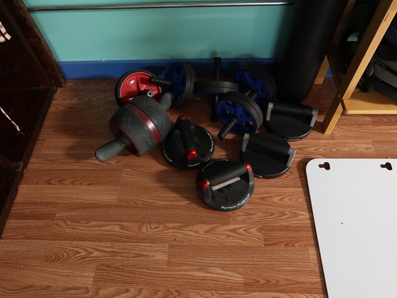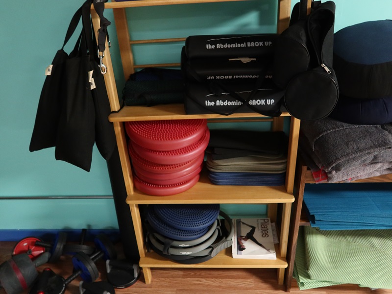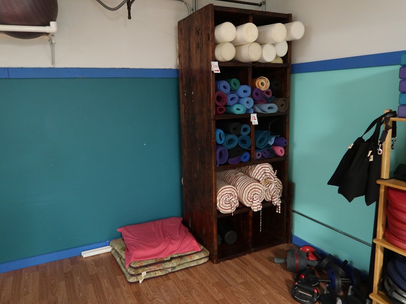 ASSORTED YOGA EQUIPMENT/ACCESSORIES & MISC WORKOUT EQUIPMENT (DOES NOT INCLUDE LARGE WOOD CABINET)