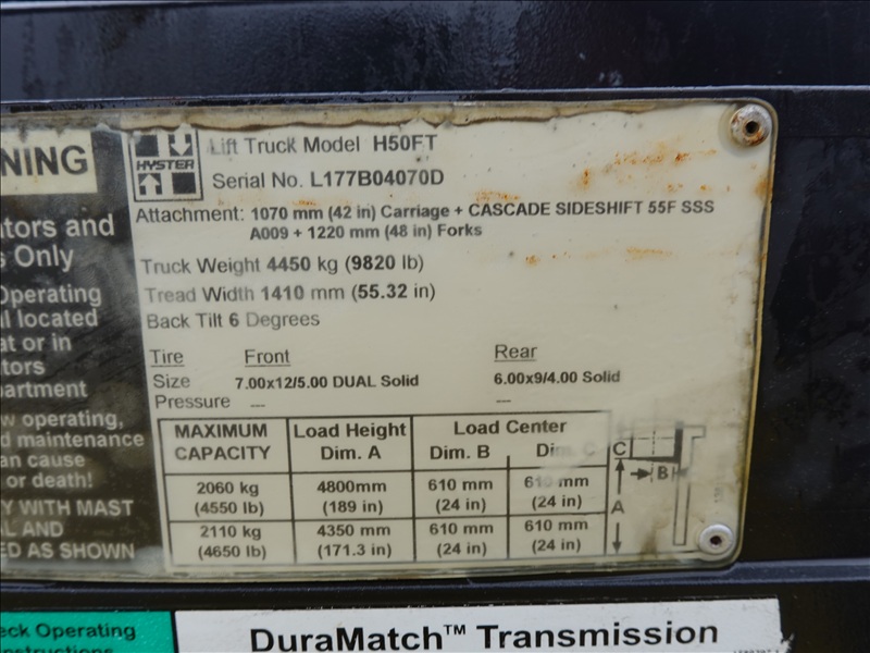4,550 LB SOLID TIRE FORKLIFT, FTC, 189" FORK HEIGHT, 3-STAGE MAST, SIDE SHIFT, 4 CYL LPG (ENGINE ISSUE, TIMING GEAR, WILL NOT START)
