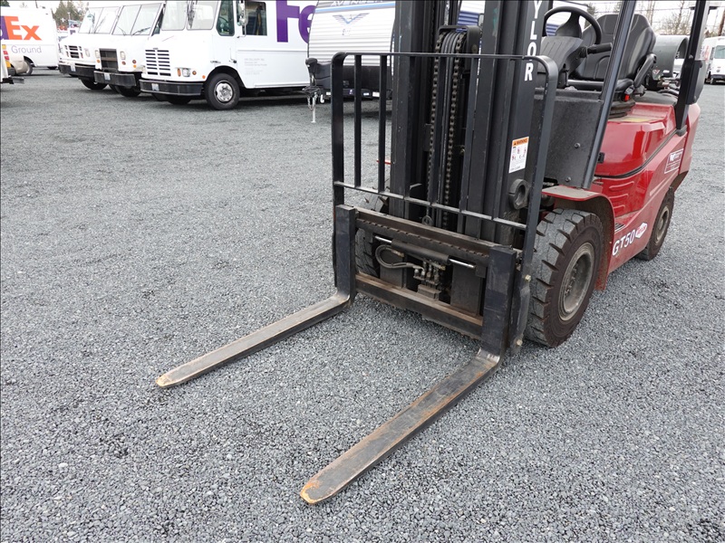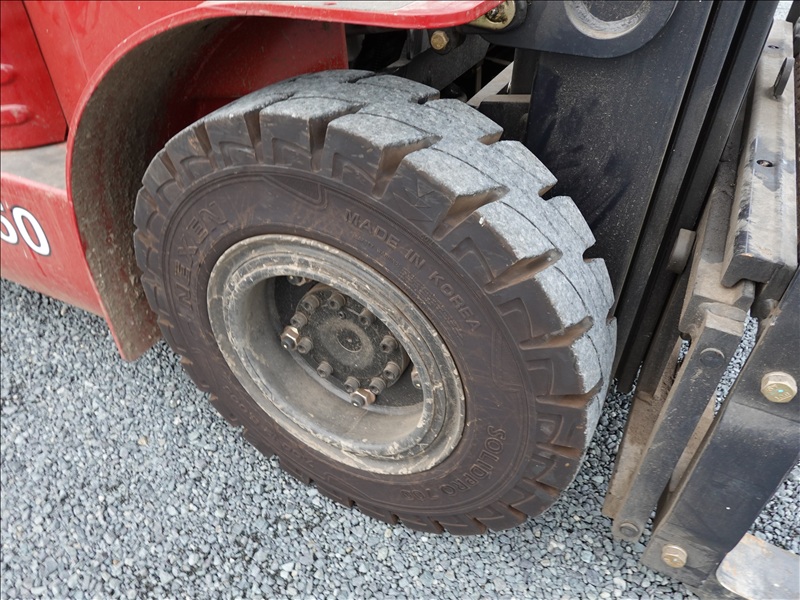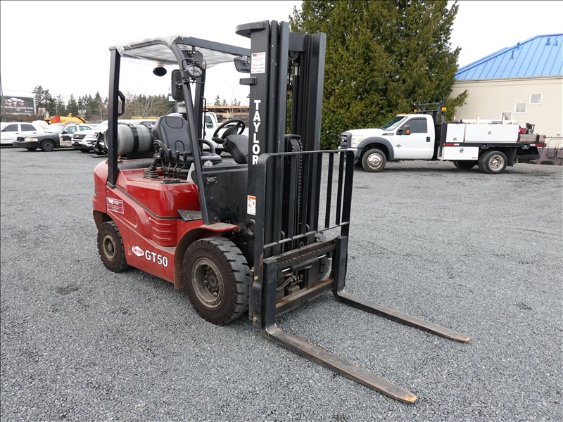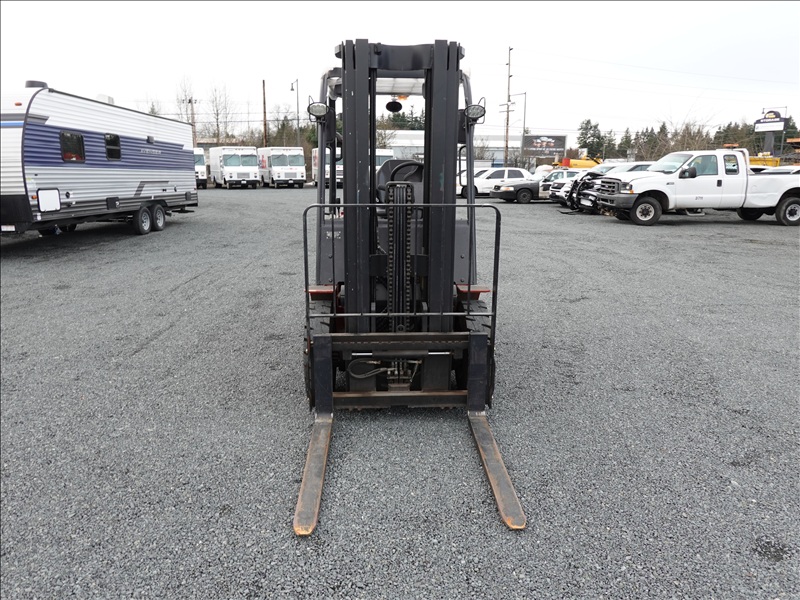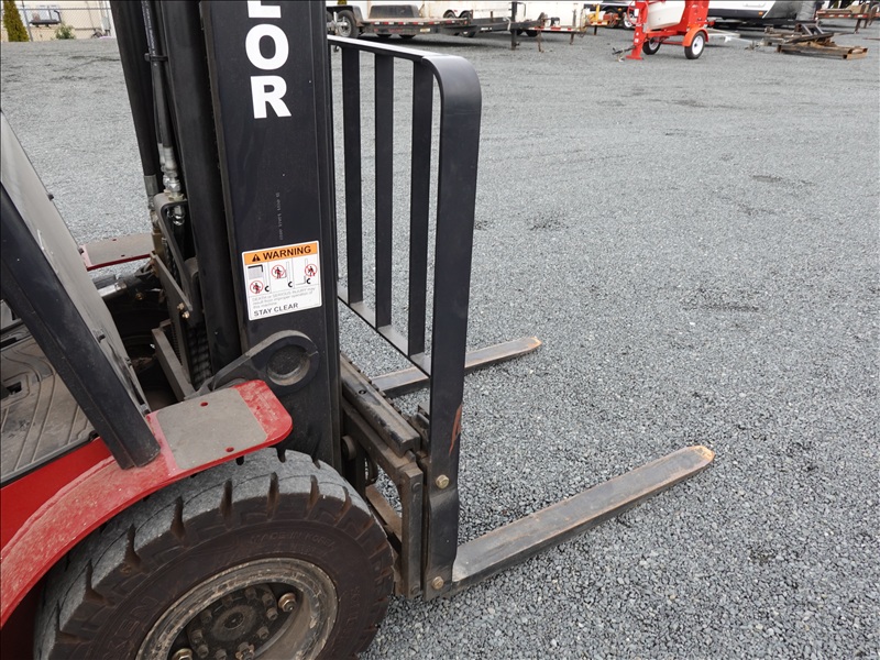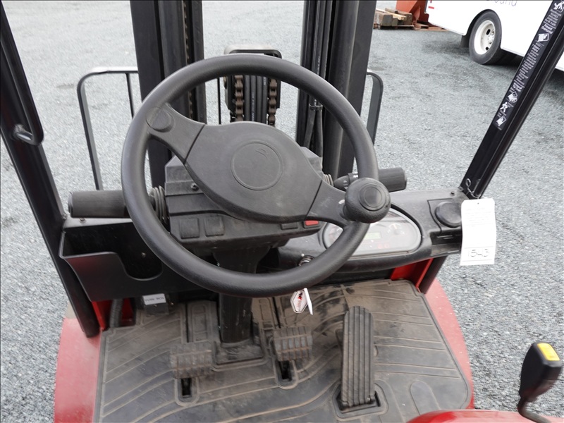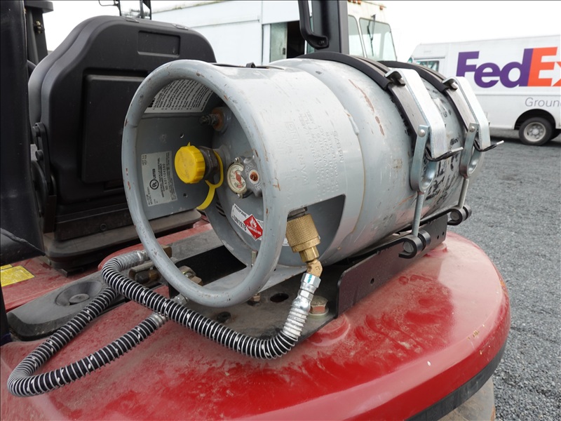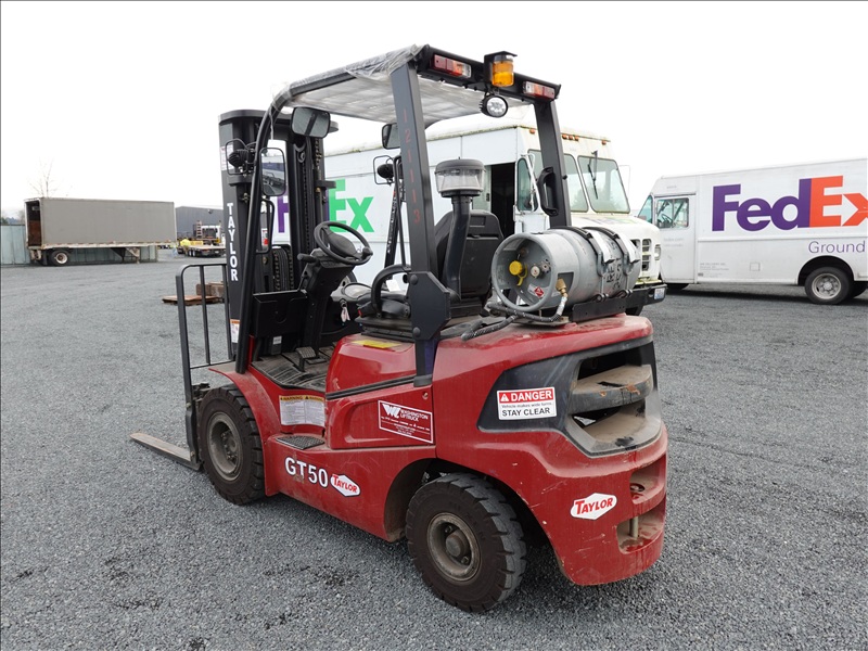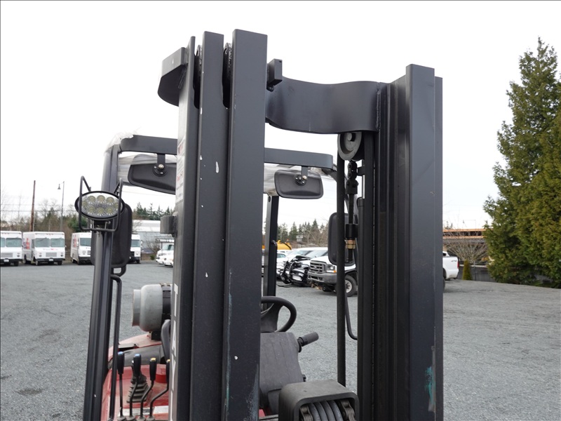5,000 LB SOLID TIRE FORKLIFT, 189" FORK HEIGHT, 3-STAGE MAST, SIDE SHIFT, 4 CYL LPG